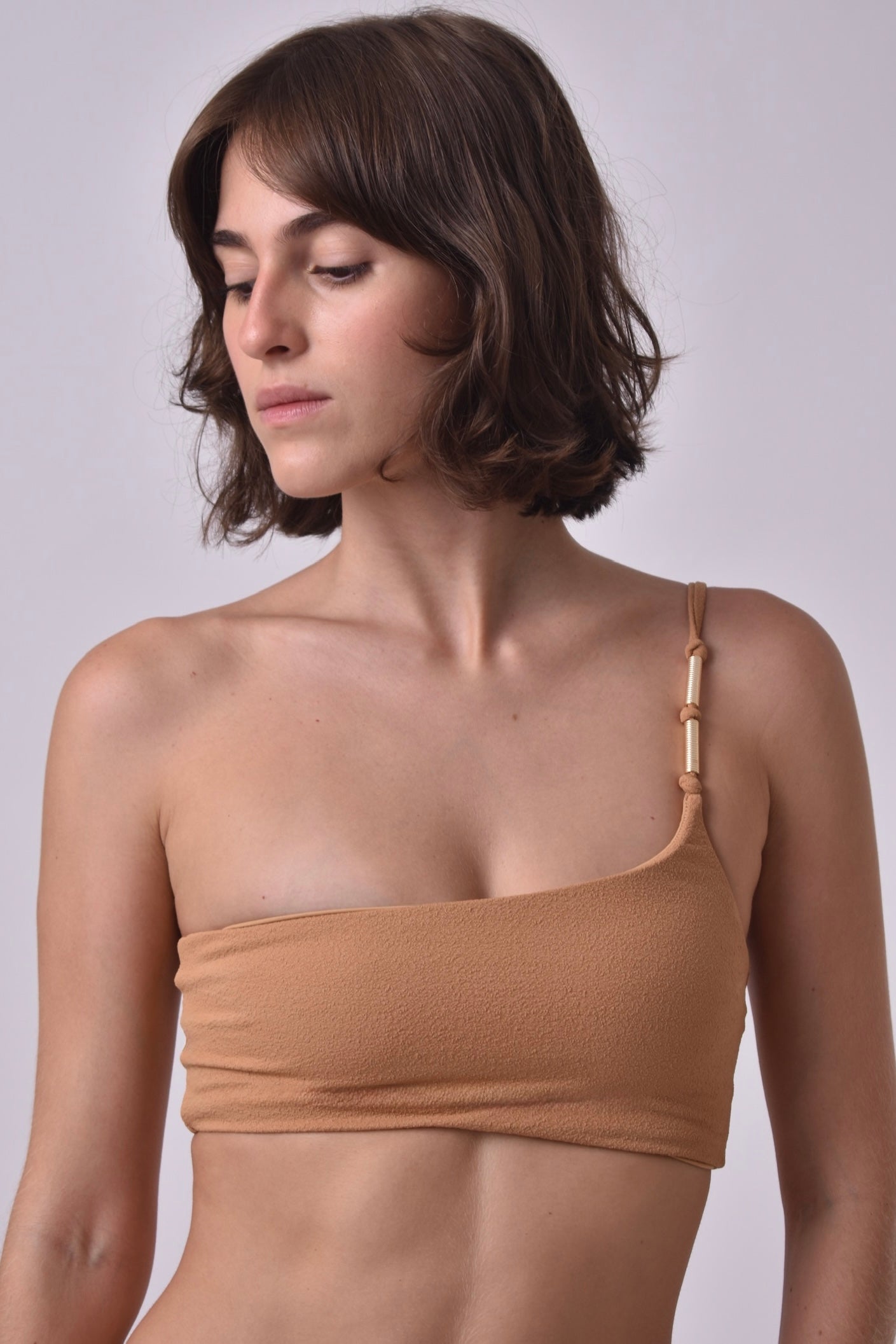 Com design clean e sofisticado, o top assimétrico areia traz personalidade e leveza em um só look. A modelagem de um ombro só valoriza o colo e deixa o visual minimalista, mas com um toque de ousadia. O detalhe do aviamento em dourado na alça adiciona charme a mais.